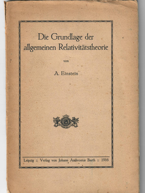 Einstein, Albert (1879-1955) Die Grundlage der allgemeinen Relativitätstheorie. Verlag von Johann Ambrosius Barth, Leipzig, 1916; Druck von Metzger & Wittich in Leipzig [Rarität!]. Einzelausgabe von Einsteins Grundlegung der Allgemeinen Relativitätstheorie, Sonderdruck aus den Annalen der … [Weiterlesen...] Infos zum Plugin Grundlage der allgemeinen Relativitätstheorie