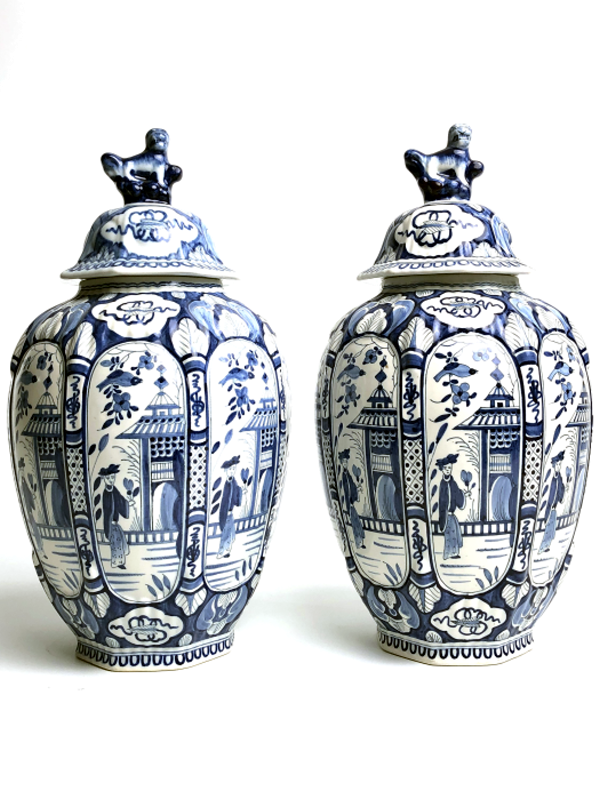 Zwei Künersberger Fayence Zwillingsvasen mit Deckel 1745-1765. Jakob von Küner. Delfter Stil. Höhe ohne deckel je 24 cm, Höhe mit Deckel 34 cm, ∅ Lippe (oben) 8 cm, ∅ Fuß 9,5 cm, ∅ Bauch bis 18 cm. … [Weiterlesen...] Infos zum Plugin Künersberger Fayence Zwillingsvasen mit Deckel