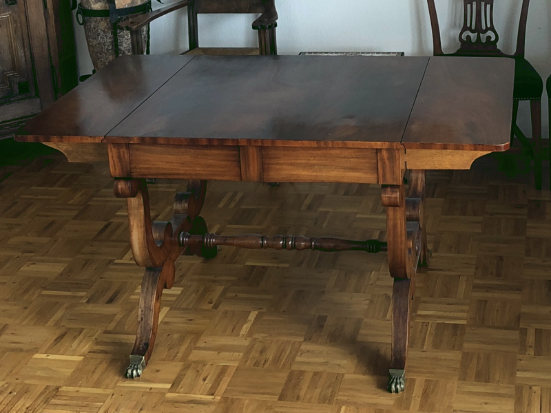 Querrechteckige Platte mit zwei seitlich anhängenden kleinen Platten. Gerade Zarge mit kaschiert eingesetzten zwei Schubladen. Auf einem Unterteil, das aus jeweils zwei S-förmig sich kreuzenden Vierkantfüßen gebildet wird, die durch eine gedrechselte Mittelstrebe verbunden sind. Bronzeschuhe in Form von Tierkrallen.