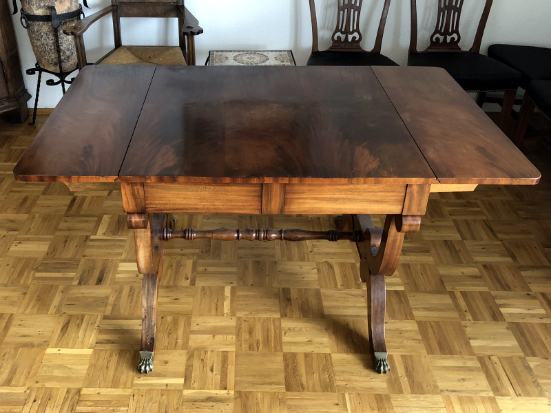 Tisch, Mahagoni, Ornament geschnitzt, nach Karl Friedrich Schinkel, um 1825. Querrechteckige Platte mit zwei seitlich anhängenden kleinen Platten. Gerade Zarge mit kaschiert eingesetzten zwei Schubladen. Auf einem Unterteil, das aus jeweils zwei S-förmig sich kreuzenden Vierkantfüßen gebildet wird, … [Weiterlesen...] Infos zum Plugin Tisch, Mahagoni, Ornament geschnitzt, nach Karl Friedrich Schinkel, um 1825